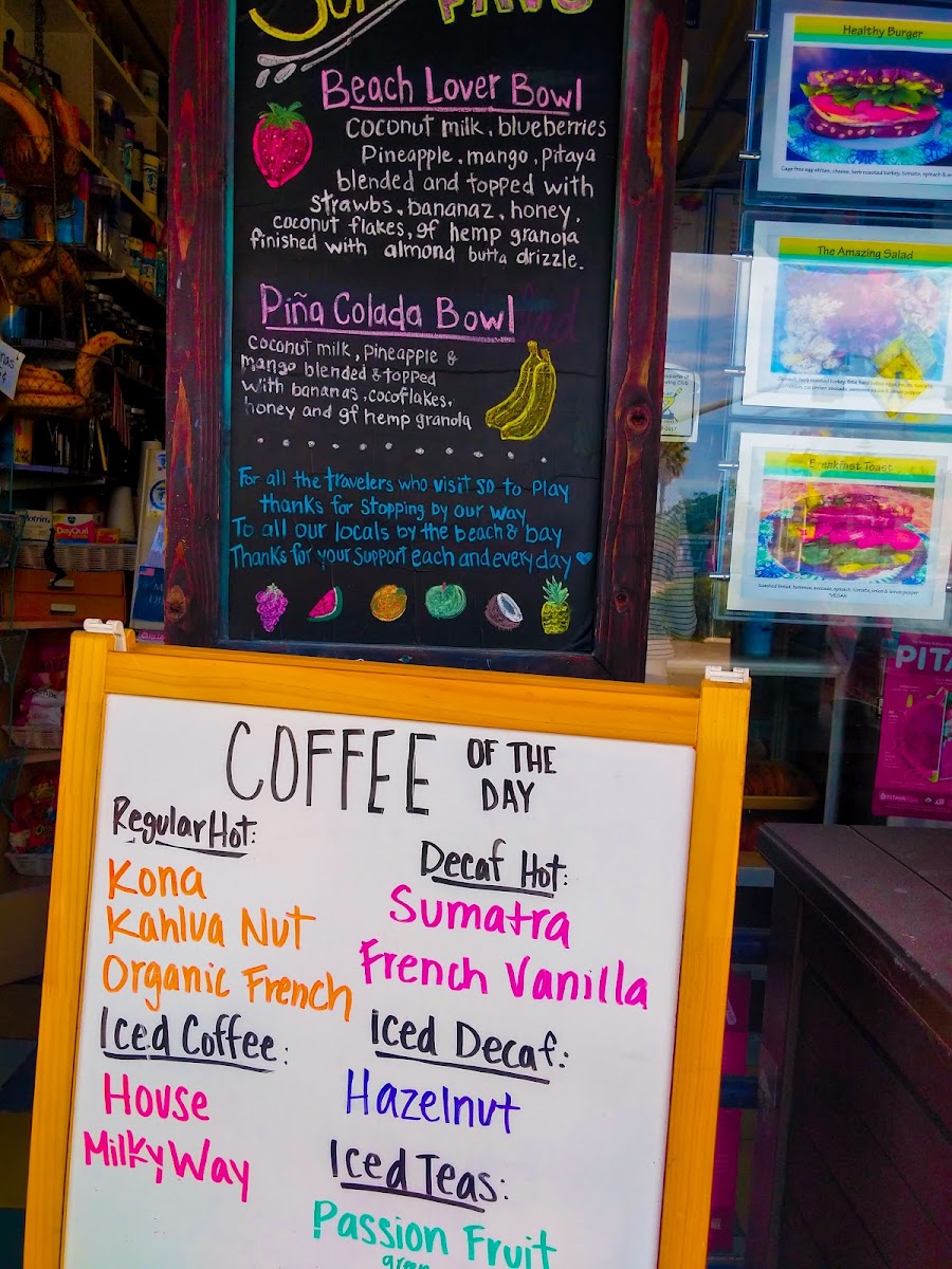 Coconut milk, blueberries, pineapple, mango, & pitaya dragon fruit blended then topped with strawberries, bananas, honey, coconut flakes gluten free organic hemp plus granola and the finishing touch almond butter drizzle